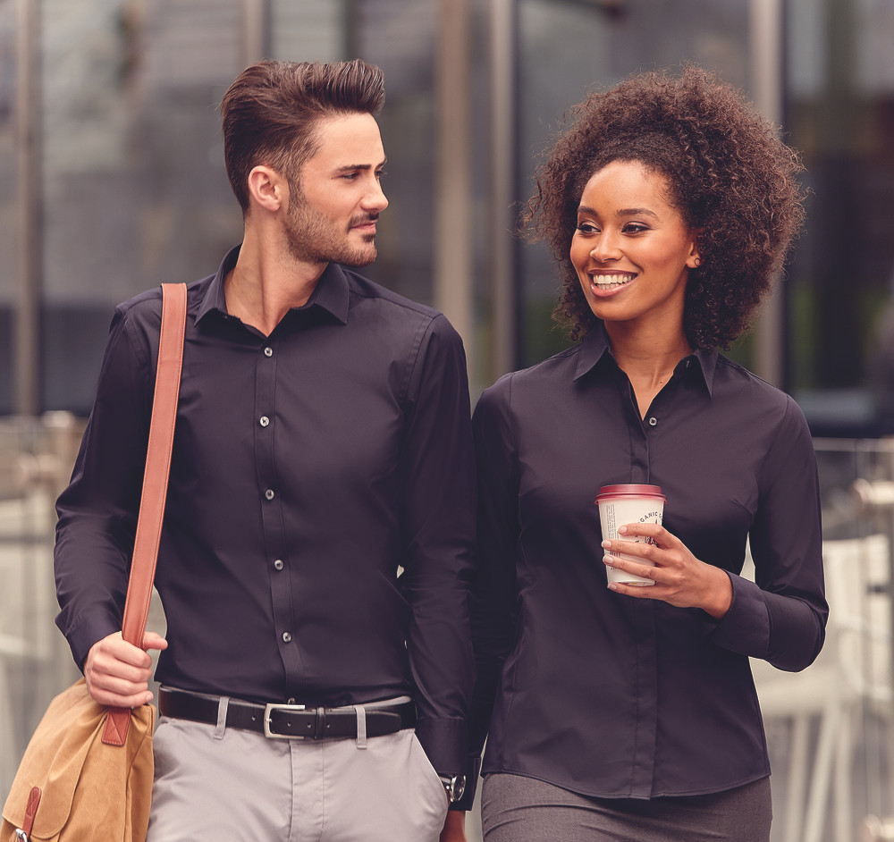 75% cotton / 25% Elastomultiester. Excellent shape retention for a lasting fit. Moisture management for cool comfort. Durable fabric. Fitted silhouette. Neat, modern collar. Hidden button placket. Princess panels (without side seams). Short band, semi-flared neck. Narrow button placket. Darts at back. Neapolitan cuffs. Lycra® swing ticket. Cuff link options. Without pockets.